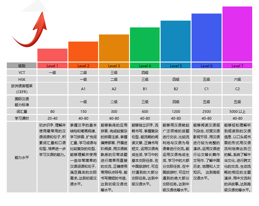 In accordance with the "HSK/YCT" curriculum standards of Hanban (Confucius Institute), with reference to Chinese language teaching and the European language framework, a 7-level Chinese language teaching standard is set to cover the learning needs of all ages from children to adults